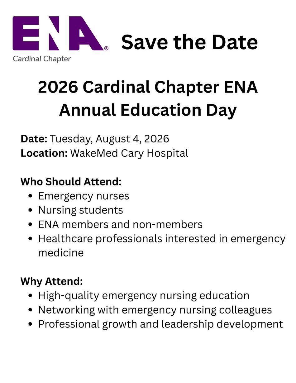 Cardinal Chapter is excited to announce the 2026 Cardinal Chapter ENA Education Day Save the Date! Put it on your calendar and plan to join us for a day filled with education, networking and fun!
